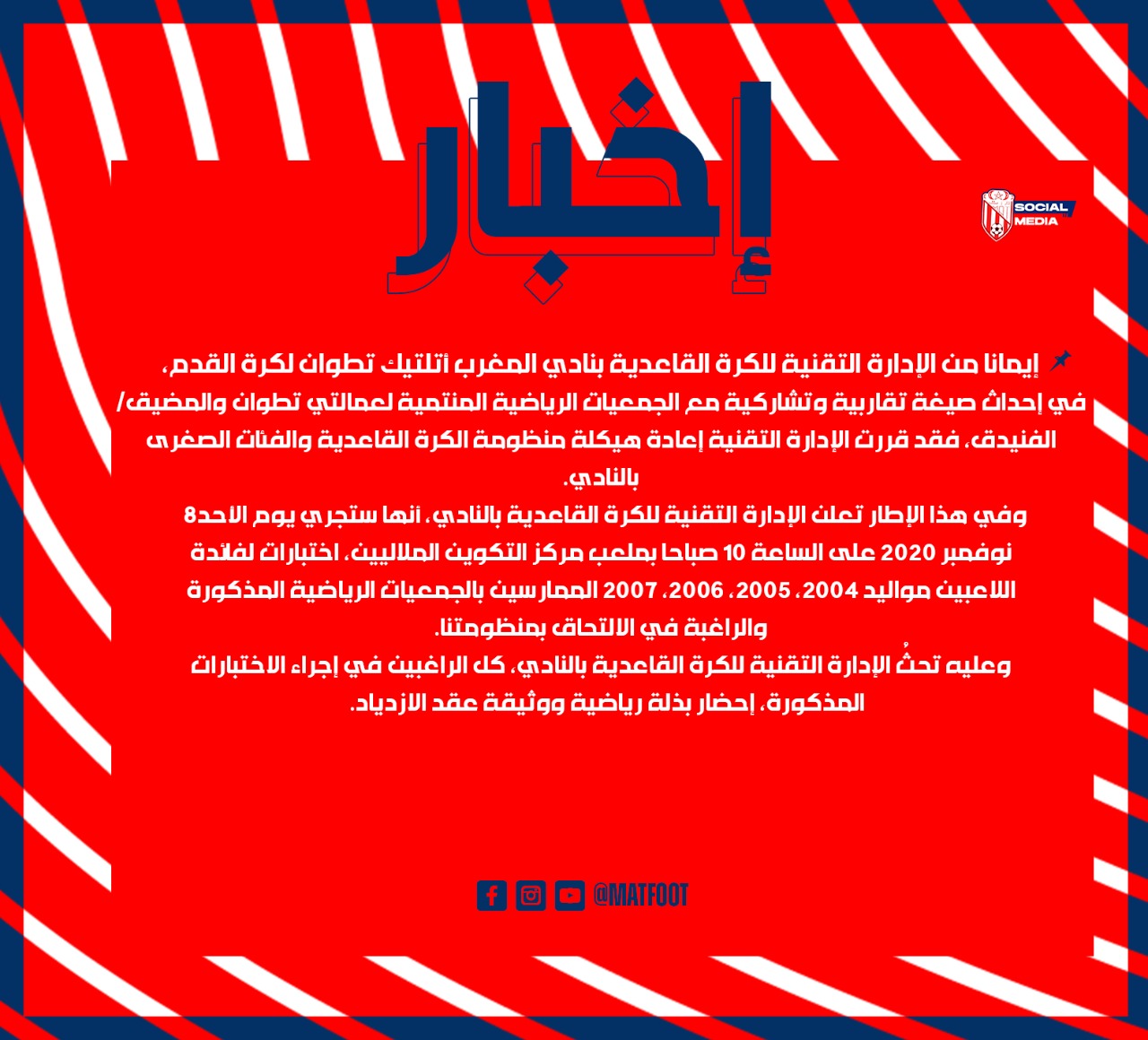 تعلن الإدارة التقنية للكرة القاعدية بنادي المغرب أتلتيك تطوان لكرة القدم، عن إعادة هيكلة منظومة الكرة القاعدية والفئات الصغرى بالنادي، وذلك إيمانا منها في إحداث صيغة تقاربية وتشاركية مع الجمعيات الرياضية المنتمية لعمالتي تطوان والمضيق/الفنيدق.