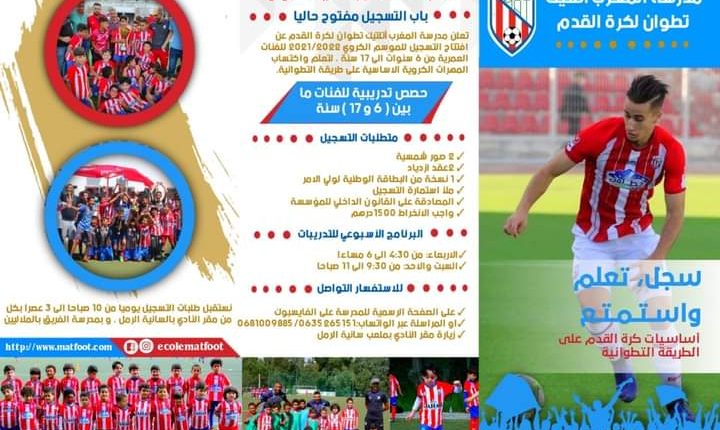 تعلن مدرسة المغرب أتلتيك تطوان لكرة القدم، عن انطلاق عملية التسجيل للموسم الكروي 2021/2022، للفئات السنية من 6 سنوات الى 17 سنة، لتعلم واكتساب المهارات الكروية الاساسية على الطريقة التطوانية.