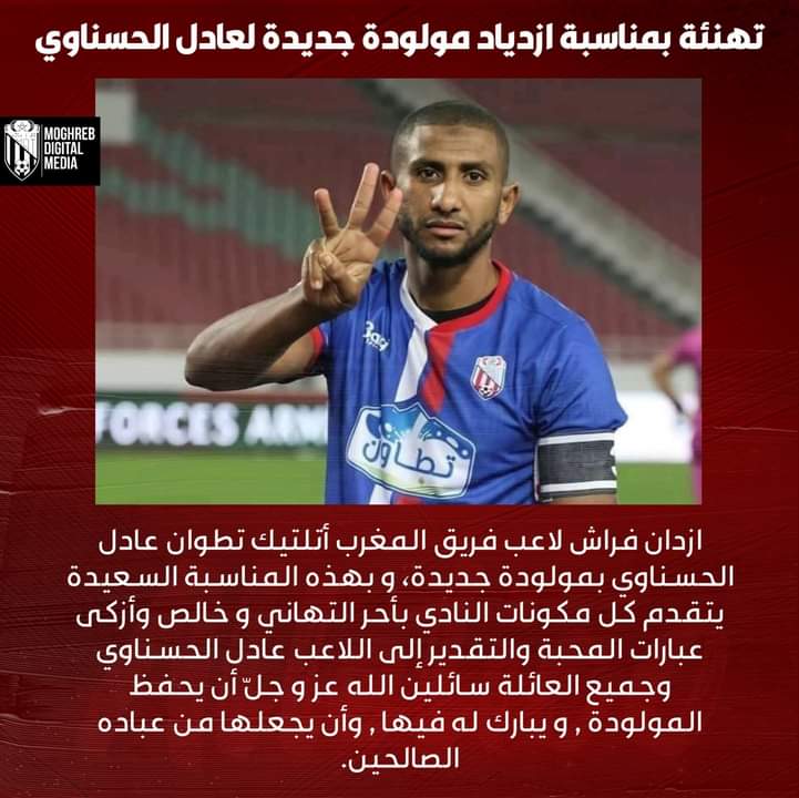 ازدان فراش لاعب فريقنا المغرب أتلتيك تطوان عادل الحسناوي بمولودة جديدة، وبهذه المناسبة السعيدة تتقدم كل مكونات النادي بأحر التهاني وأخلص وأزكى عبارات المحبة والتقدير إلى اللاعب عادل الحسناوي وكافة أفراد أسرته الكريمة، سائلين الله عز وجل أن يحفظ المولودة ويبارك له فيها وأن يجعلها من عباده الصالحين.